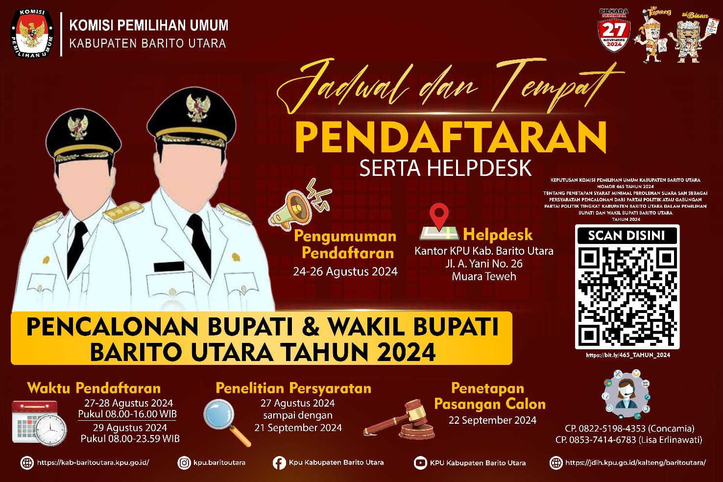 Jadwal, Tempat dan Helpdesk Pendaftaran Pasangan Calon Bupati dan Wakil Bupati Barito Utara Tahun 2024