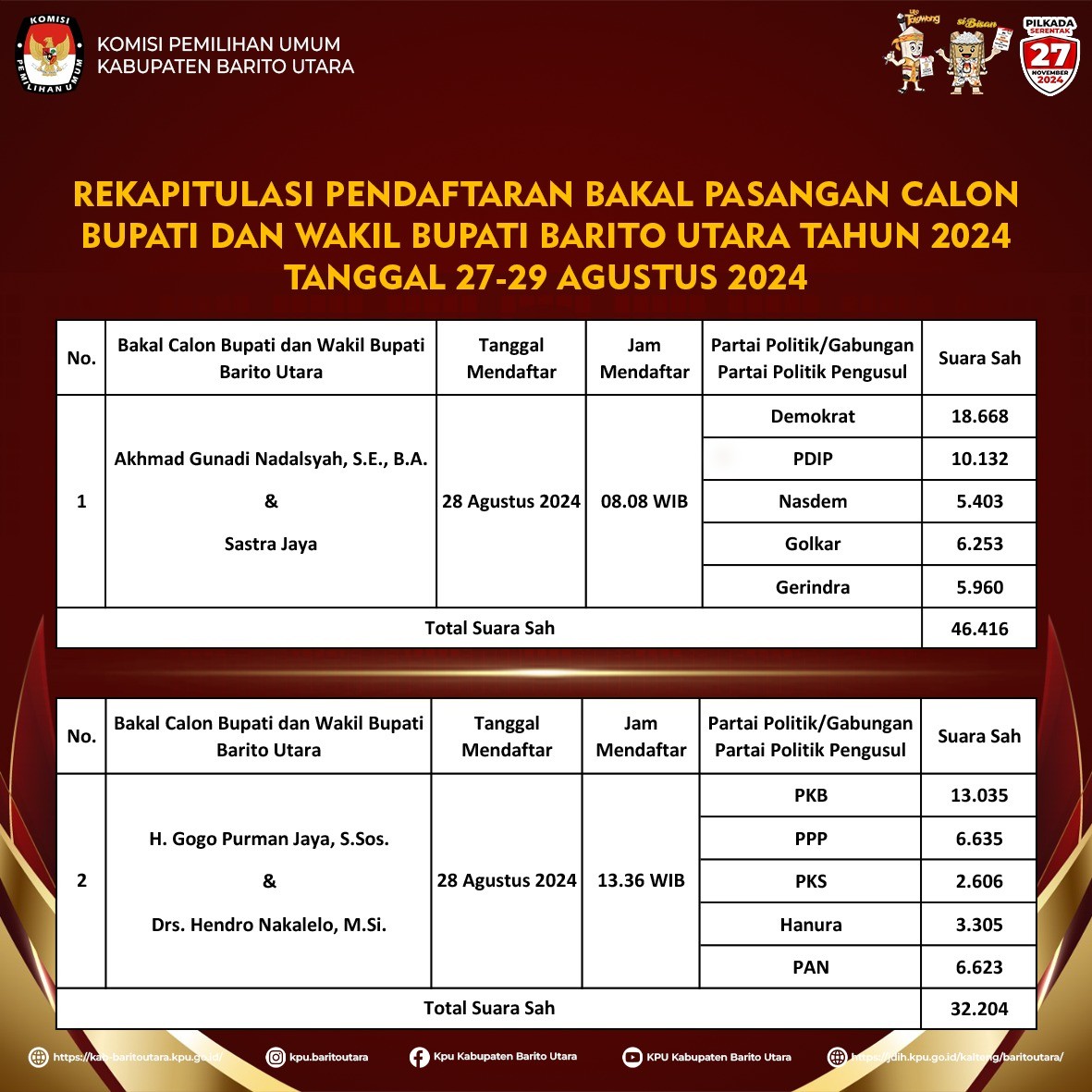 Rekapitulasi Pendaftaran Bakal Pasangan Calon Bupati dan Wakil Bupati Barito Utara Tahun 2024 (27-29 Agustus 2024)