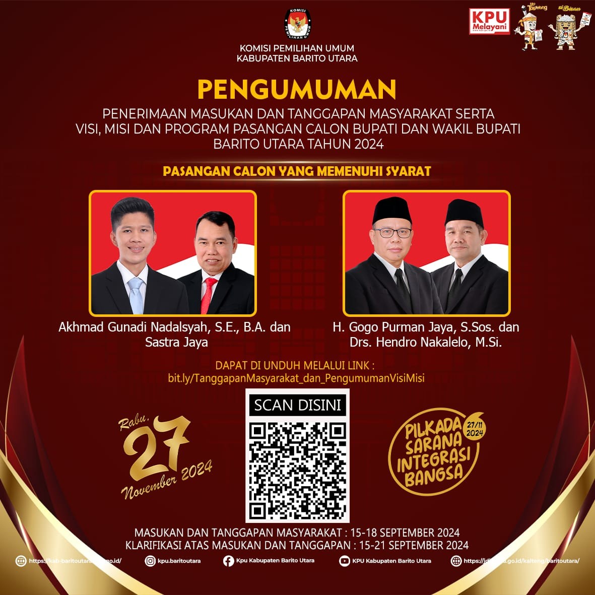 Pengumuman Pasangan Calon Yang Memenuhi Syarat (Penerimaan Masukan dan Tanggapan Masyarakat serta Visi, Misi dan Program Pasangan Calon Bupati dan Wakil Bupati Barito Utara Tahun 2024)