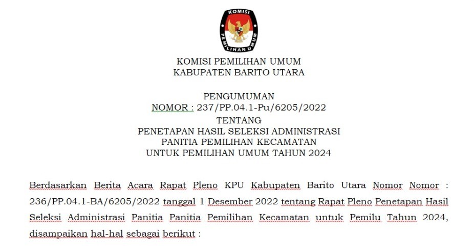PENGUMUMAN NOMOR : 237/PP.04.1-Pu/6205/2022 TENTANG PENETAPAN HASIL SELEKSI ADMINISTRASI PANITIA PEMILIHAN KECAMATAN UNTUK PEMILIHAN UMUM TAHUN 2024 DI KPU KABUPATEN BARITO UTARA Jumat, 02 Desember 2022 00:00 1663 Link Unduh/Download PENGUMUMAN HASIL SELEKSI ADMINISTRASI (KLIK) Link Unduh/Download FORMULIR TANGGAPAN MASYARAKAT (KLIK) Baca Selengkapnya