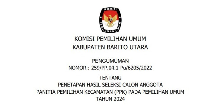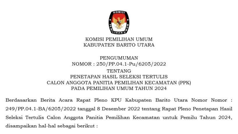 PENGUMUMAN NOMOR : 259/PP.04.1-Pu/6205/2022 TENTANG PENETAPAN HASIL SELEKSI CALON ANGGOTA PANITIA PEMILIHAN KECAMATAN (PPK) PADA PEMILIHAN UMUM TAHUN 2024 Jumat, 16 Desember 2022 00:00 1490 Link Unduh/Download PENGUMUMAN TENTANG PENETAPAN HASIL SELEKSI CALON ANGGOTA PANITIA PEMILIHAN KECAMATAN (PPK) PADA PEMILIHAN UMUM TAHUN 2024 (KLIK) Baca Selengkapnya