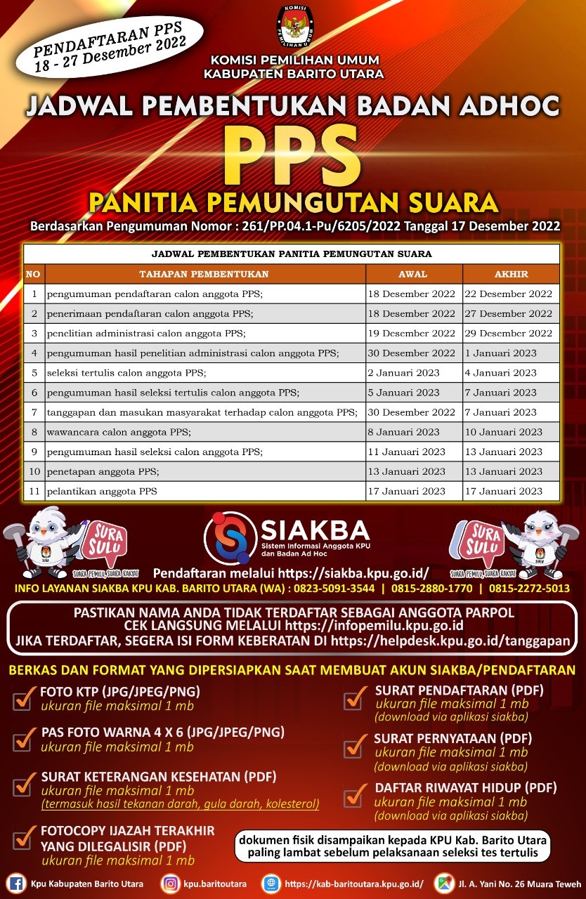 PENGUMUMAN NOMOR : 261/PP.04.1-Pu/6205/2022 TENTANG SELEKSI CALON ANGGOTA PANITIA PEMUNGUTAN SUARA UNTUK PEMILIHAN UMUM TAHUN 2024 DI KABUPATEN BARITO UTARA Minggu, 18 Desember 2022 00:00 1562 - Pengumuman.Pdf (Unduh/Download) - Surat Pendaftaran, Pernyataan, Daftar Riwayat Hidup.Doct (Unduh/Download) Baca Selengkapnya