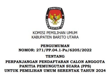 PENGUMUMAN NOMOR : 271/PP.04.1-Pu/6205/2022 TENTANG PERPANJANGAN PENDAFTARAN CALON ANGGOTA PANITIA PEMUNGUTAN SUARA (PPS) UNTUK PEMILIHAN UMUM SERENTAK TAHUN 2024 Sabtu, 31 Desember 2022 00:00 1411 Pengumuman.Pdf (Unduh/Download) Baca Selengkapnya