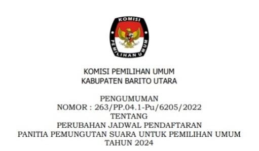 PENGUMUMAN NOMOR : 263/PP.04.1-Pu/6205/2022 TENTANG PERUBAHAN JADWAL PENDAFTARAN PANITIA PEMUNGUTAN SUARA UNTUK PEMILIHAN UMUM TAHUN 2024 Jumat, 23 Desember 2022 00:00 1324 Pengumuman.Pdf (Unduh/Download) Baca Selengkapnya